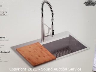Lot Details: Includes sink, faucet, accessories and drain. 18ga stainless steel. 33" L x 22" W x 9" D. Like new complete. Bamboo cutting board, silicone sink mat included.