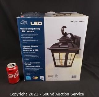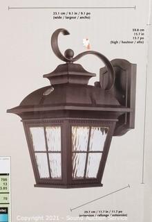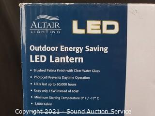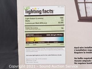 Lot Details: Brushed nickel finish with clear water glass. 13w, 700lm, 3000k color. 15.7" H x 9.1" D x 11.7" D.