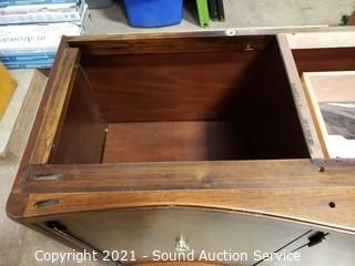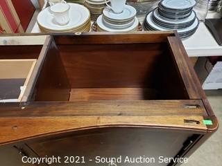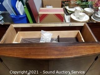 Lot Details: In great condition other than missing the top. 34" H x 77" W x 20" D. Single Drawer with silver cloth flatware tray.