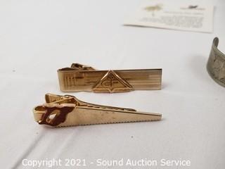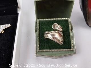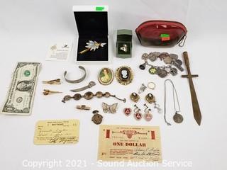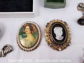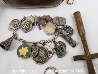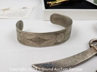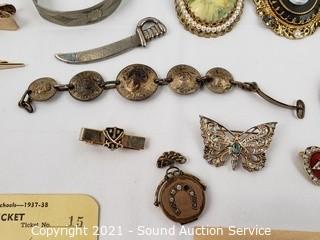 Lot Details: Charm bracelet (some of the charms are sterling), W.Germany cameo brooch & erring set, letter opener, tie clips, brooches (one is Swarovski crystal), rings.