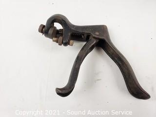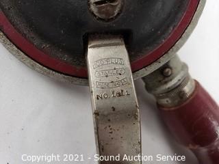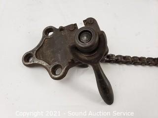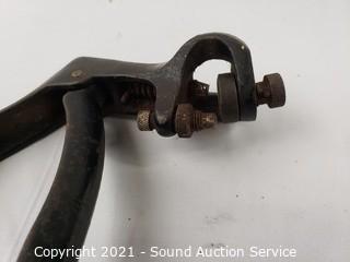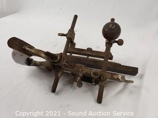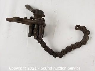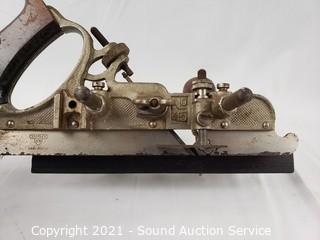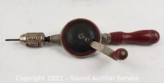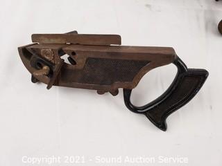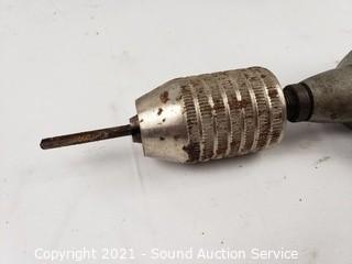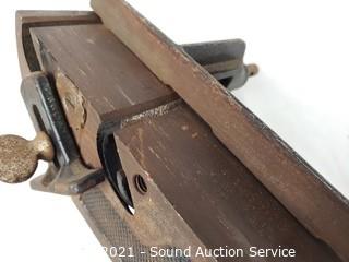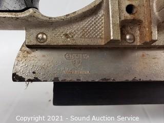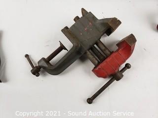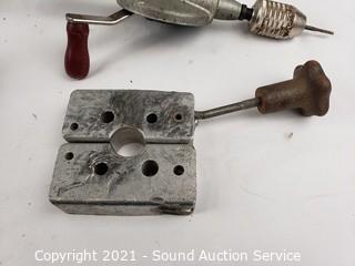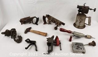 Lot Details: Hand drill, torch, contour planes (Stanley #45 and other), pipe chain clamp, 2.5" jaw table mount vise and more.