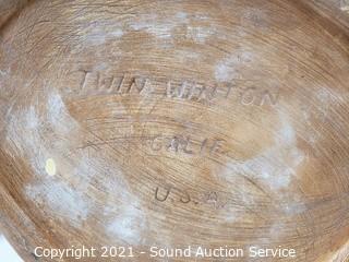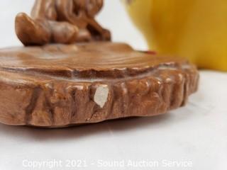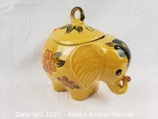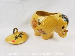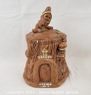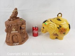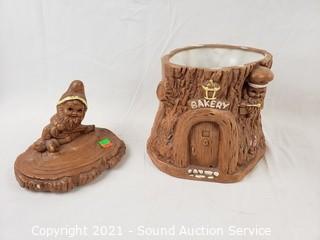 Lot Details: Elephant (unmarked) and Gnome Tree House (Twin Wenton USA Pottery). Tree House has a small chip on the lid, refer to photos. 11" x 12" x 7" and 12" x 7".