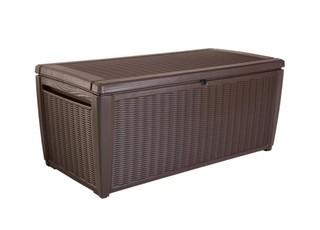 Lot Details: 770lb maximum weight on lid, lockable design for enhanced security, all weather, 57" x 28.7" x 25", elegant rattan design, brown finish. Unassembled in original packaging.