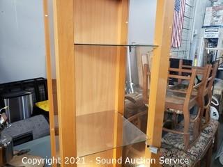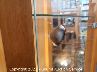 Lot Details: Lighted is mounted to the lowest shelf and shines up & down. Glass door, sides and shelves. Small scuff on the top and bottom of wood frame, otherwise in excellent condition. 74" H x 17.5" W x 16" D.