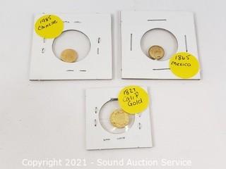 Lot Details: 1865 Mexico, 1985 Chinese and 1827 1/2 California Gold. Approx. 7/8" diameter. Unsure if solid gold or plated.