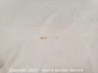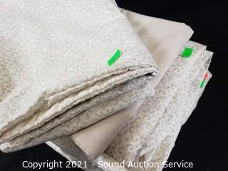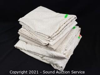 Lot Details: 1 flat, 1 fitted and 4 pillow cases. One pillow case has a small stain/dirty spot. Beige print, 100% polyester microfiber.