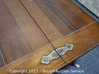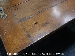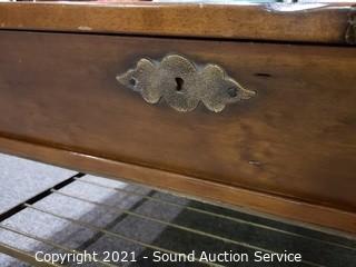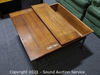 Lot Details: Lift top storage, lower steel wire shelf, rustic finish. In excellent condition. 19" H x 40" x 40". Matches the next few lots. Made in Indonesia.