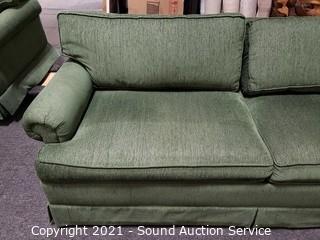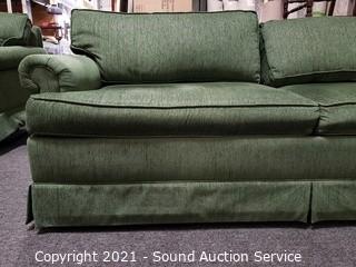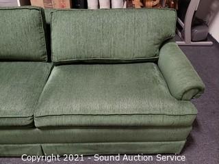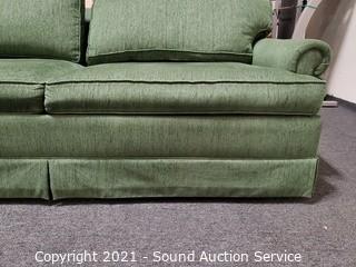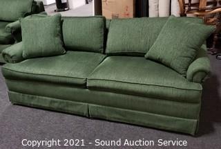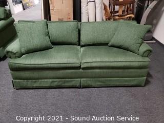 Lot Details: Green fabric w/2 matching throw pillows. In excellent condition. 29" H x 79" W x 36" D x 19" to seat. Contrasts nicely with the red sleeper love seats.