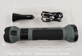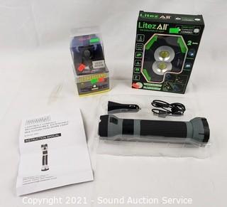 Lot Details: Includes 12V rechargeable flashlight, work light, head lamp and bicycle lamp.
