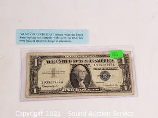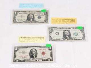 Lot Details: 1963 B $1 Scarce Barr note, 1957 B $1 Blue Seal Old Silver Certificate & Red Seal $2 note. Refer to photos for condition.