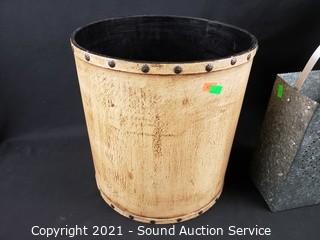 Lot Details: Handle on basket has come free, needs reattached. Metal waste bin is labeled "Renard No.4 9.3 liters". 9.5" x 6" x 4" basket, 15" x 9" diameter metal waste bin, 12" x 11" diameter wood waste bin.