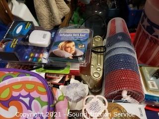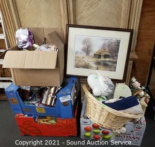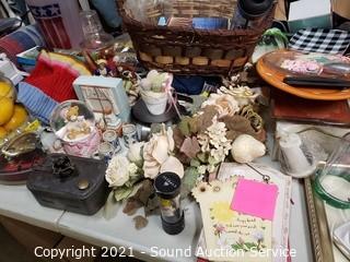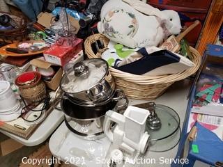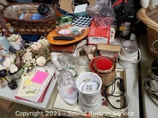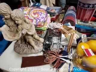 Lot Details: Includes faux floral decor, stainless cookware, salad spinner, composite statue, Radio Flyer model 5 wagon, makeup bag, foot rest, literature, toilet bowl light, hats and gloves and much more.
