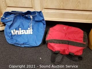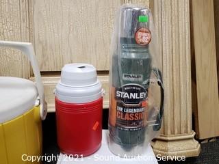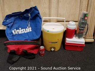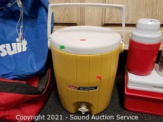 Lot Details: Includes Coleman Roundabout drink dispenser 13.5" x 12", Stanley 1.1qt thermos, Coleman plastic thermos, 6" x 7" x 9.5" Coleman cooler, 10" x 10" x 20" soft-side cooler and 15" x 20" Unisuit bag.