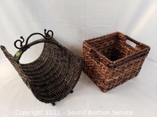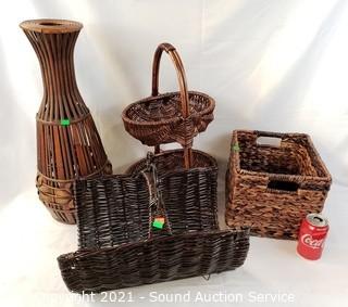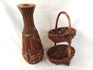 Lot Details: 23" x 8.5" bamboo woven vase, 12" x 16" x 10.5" black flower basket, 21" x 13" x 9.5" 2-tier basket organizer and 9" x 11.5" x 10" bin.
