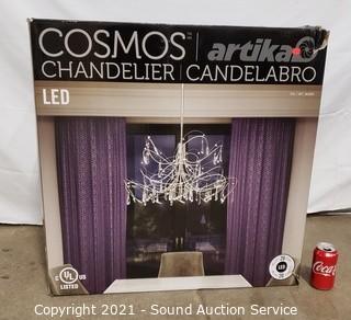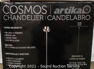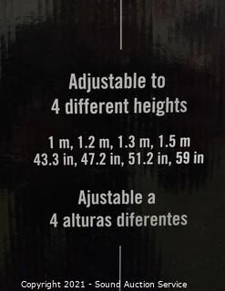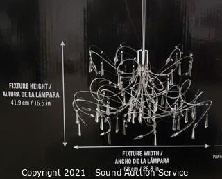 Lot Details: Only 2 of the LED bulbs are working, can be replaced. Appears complete. Chrome finish, 16.5" x 26.8" fixture, height adjusts to 4 different settings (43.3", 47.2", 51.2" and 59"). In original box.