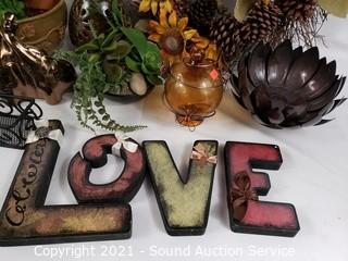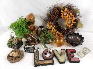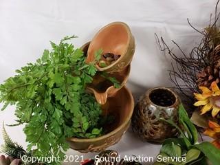 Lot Details: Pinecone wreath, faux succulents, pottery fountain decor, metal art lotus and more.