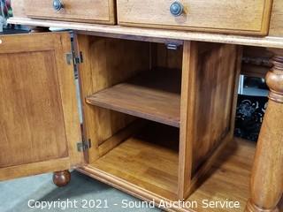 Lot Details: Finger jointed, 4 drawers, pass through cabinet with adjustable shelf. Has a scuff on the top and some minor knicks, overall great condition. 36.5" H x 41" x 24".
