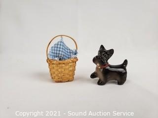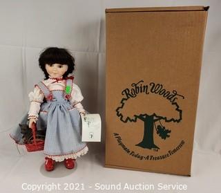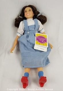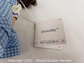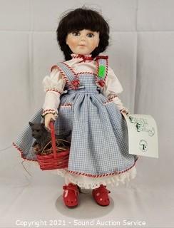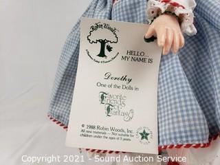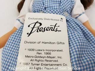 Lot Details: 4 Dorothy and 2 Toto. Includes Presents 1987 vinyl doll, Madame Alexander mini porcelain dated 2000, Effanbee miniature vinyl, 1988 Robin Woods vinyl doll and plush Toto. Smallest is 5", largest is 14". 3 dolls come with stands, Robin Woods doll comes with original box.