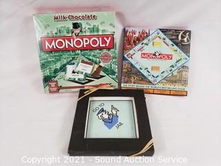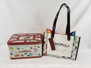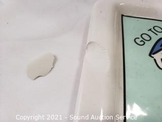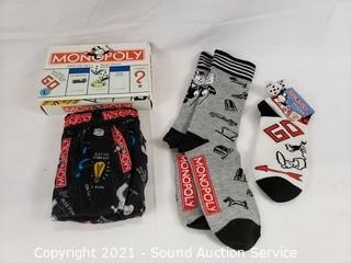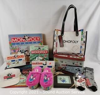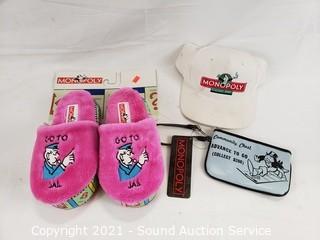 Lot Details: Includes board games, porcelain plate (has a chip), popcorn tin, slippers, cap, socks, boxer shorts, clutch, literature, tote and more.
