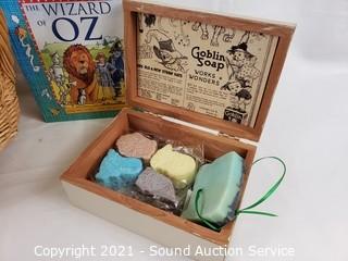Lot Details: Includes soaps, magnets, story gift set. Basket is 6" x 12" x 11".