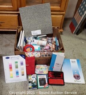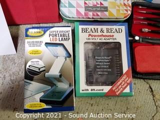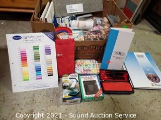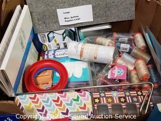 Lot Details: Gingher scissors, Ellesye precision tweezer kit, 120v AC adapter, portable led lamp, various thread, fabric marker & much more.