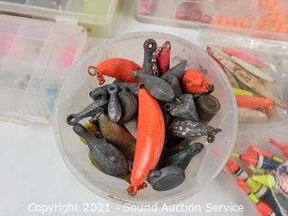 Lot Details: Lead weights, lures, bobbers, rod case and more.