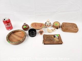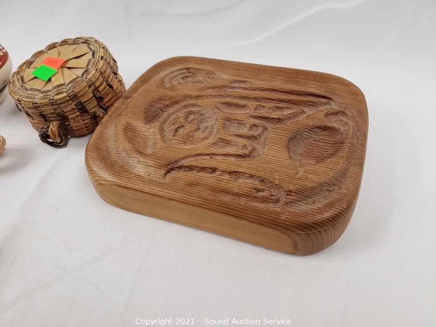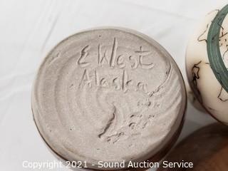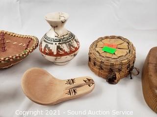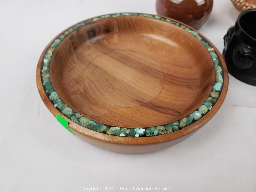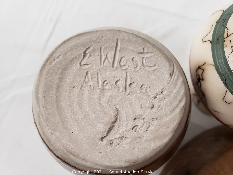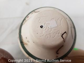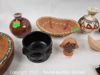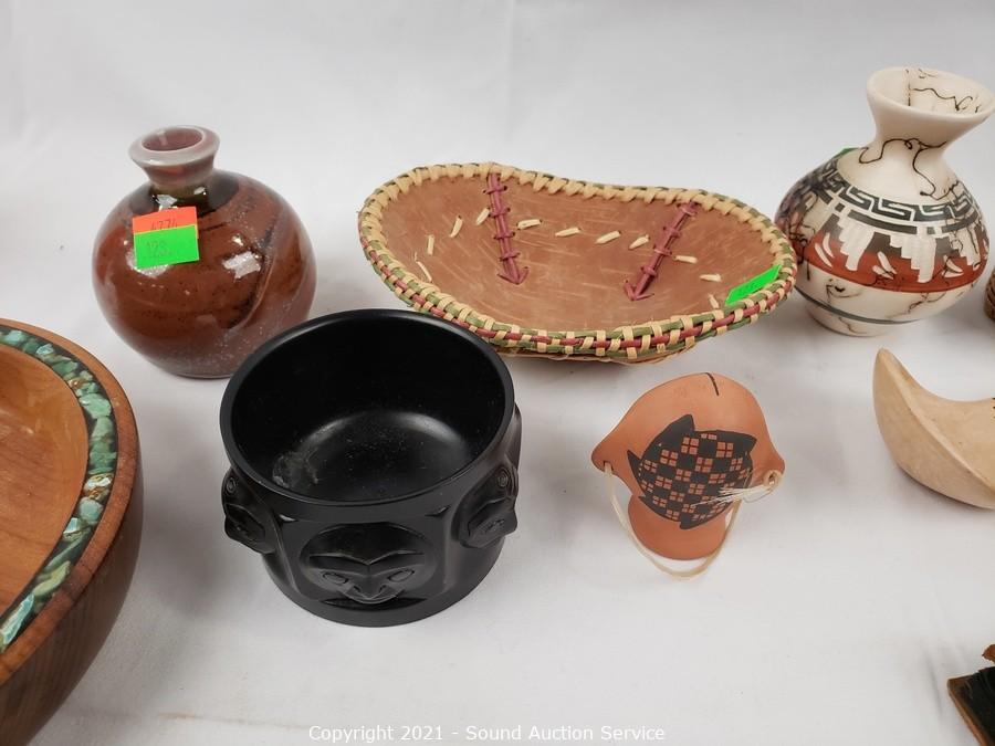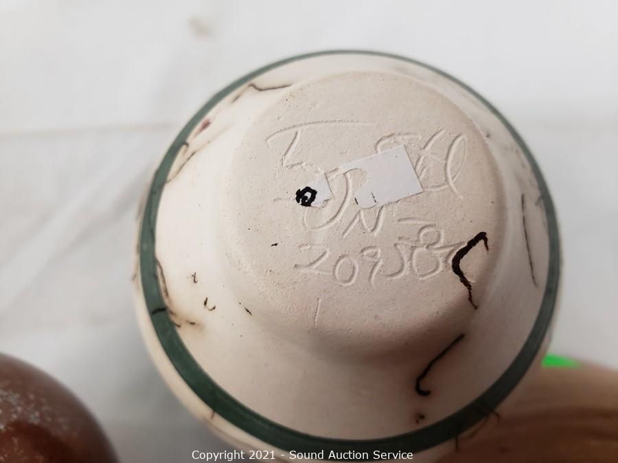 Lot Details: Signed pottery vases, woven basket, trinket box, bowls, most all are signed, refer to photos. Smallest is approx. 2" x 2", largest is 1.5" x 6.5".