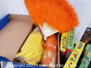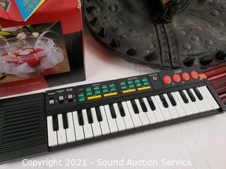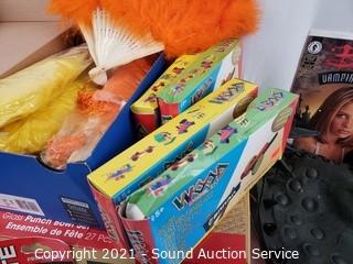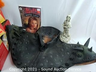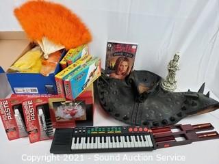 Lot Details: Includes punch bowl set, electric keyboard, Canon wood model kits, metal polishing paste, feather folding fans, pens, Buffy the Vampire Slayer comic book, costume mantle.