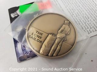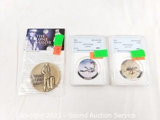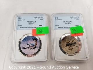 Lot Details: Coins are part of the Deadly Bugs series, 2010, graded PR70DCAM, 1000 Zambian Kwacha. Medallion is United States Navy "The Lone Sailor".