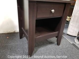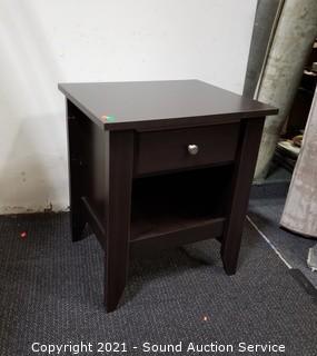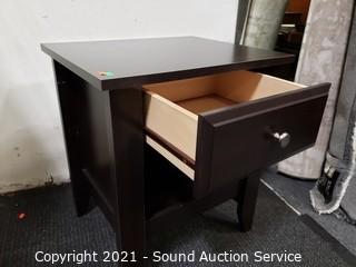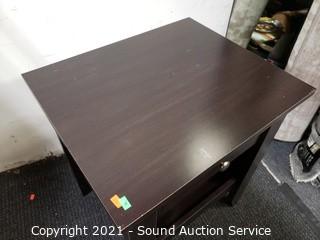 Lot Details: Single drawer with lower cabinet, dark veneer finish. 24" x 21" x 17.5".