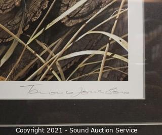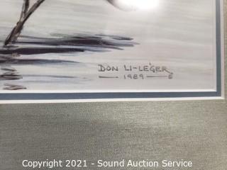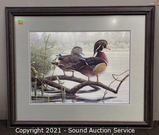 Lot Details: Dawn Li-Liger 1989 duck (lithograph or possibly original, hard to tell) professionally framed and matted with museum glass, 27" x 23", other is by Terrence James Bond, limited #495/950 pencil signed by artist, 23" x 29", with artist information on the back.