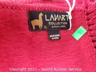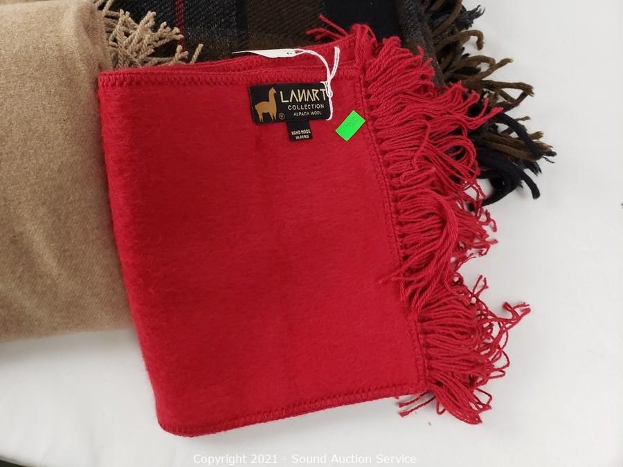 Lot Details: 64" x 54" brown and black throw, 48" x 70" alpaca wool throw, 9" x 64" Lanart alpaca wool scarf made in Peru and 72" x 80" Wool of the West blanket.