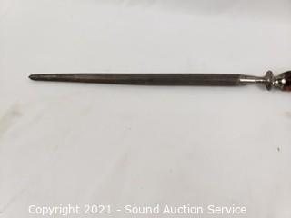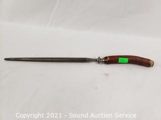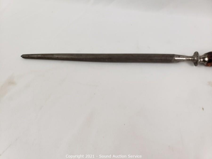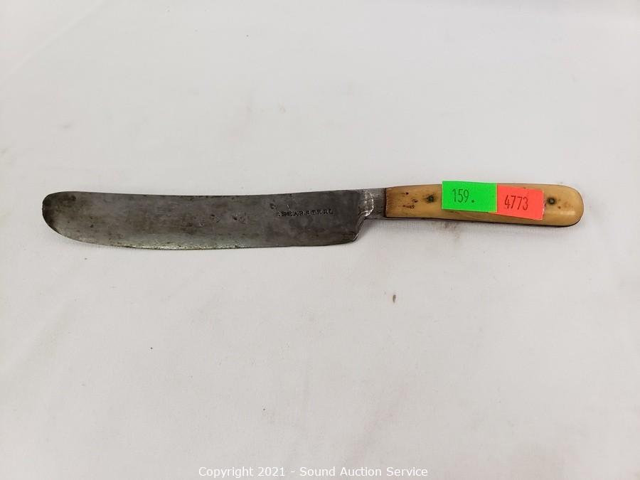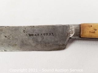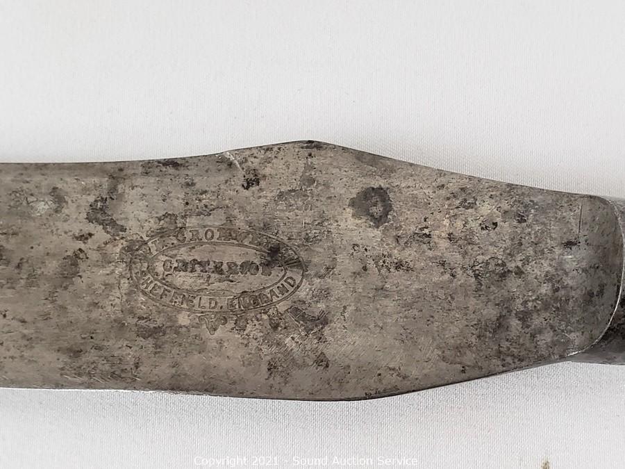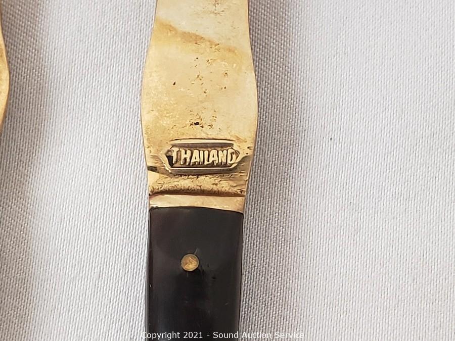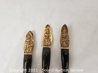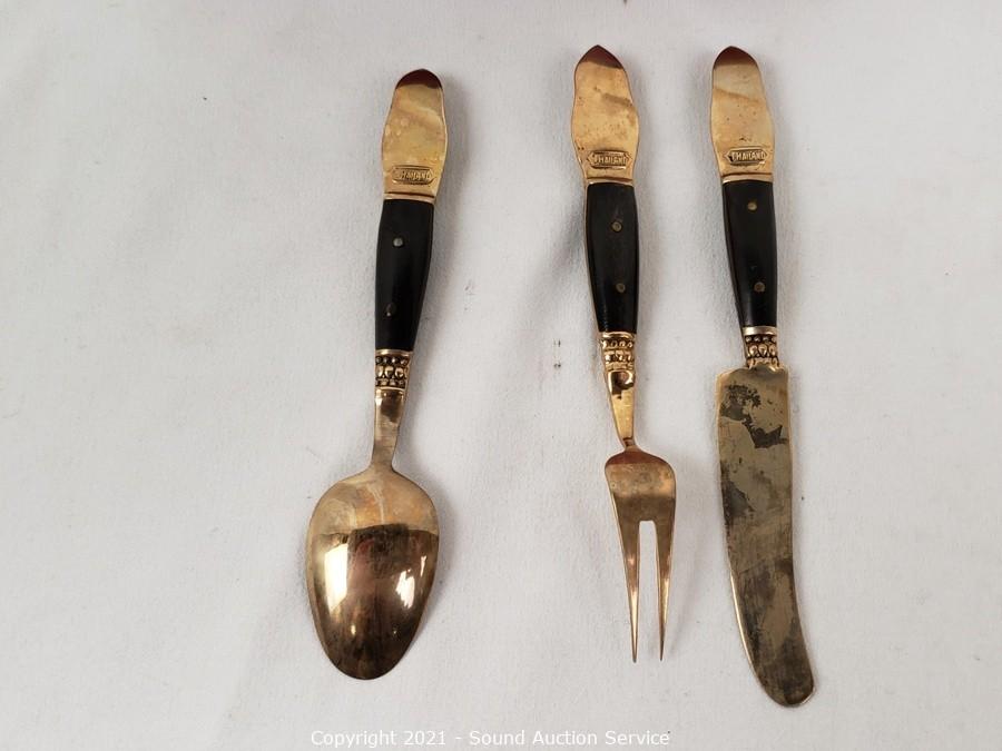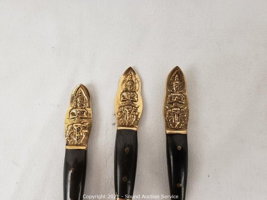 Lot Details: Utensils are gold tone with Hindu images on the handles, made in Thailand. Largest knife is marked H. Cromwell Sheffield England, spreader is marked Shear Steel.