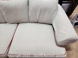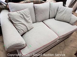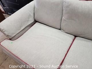Lot Details: Comes with matching throw pillows and armrest covers. 28" x 82", extra deep 40", 18" to seat. In good condition, very comfortable.