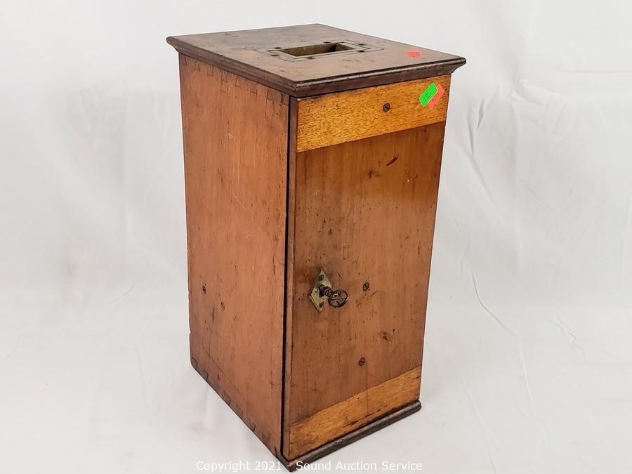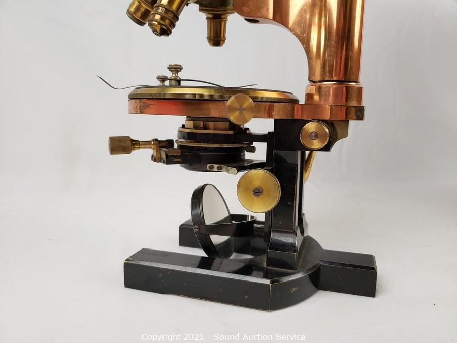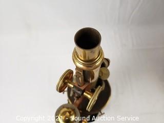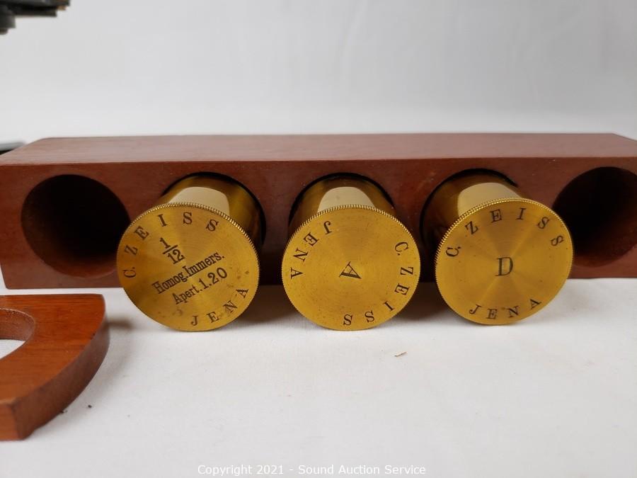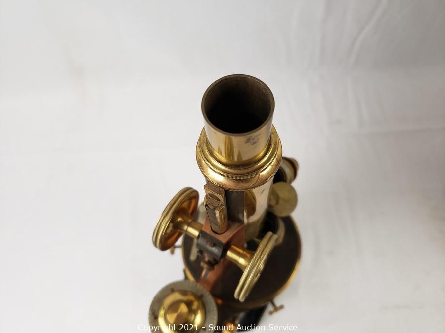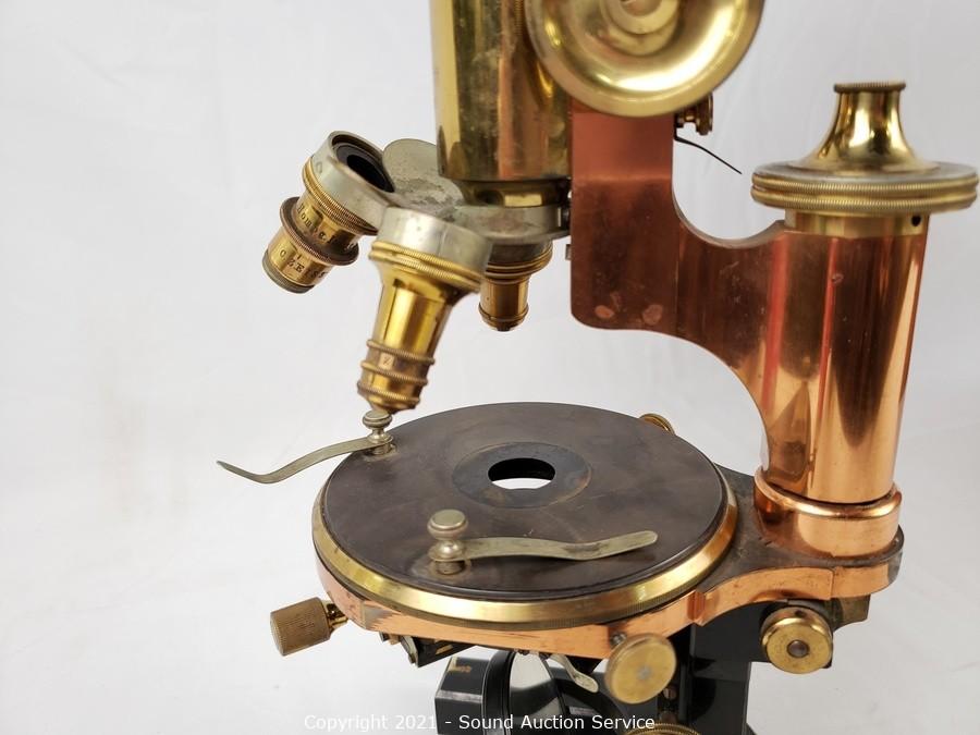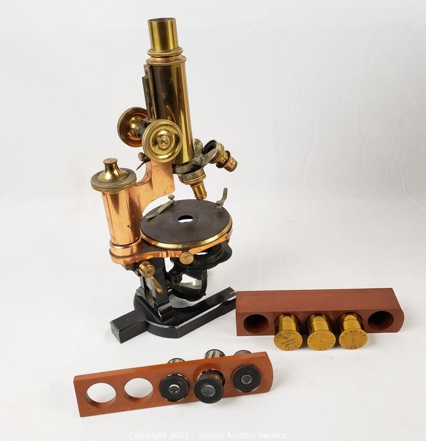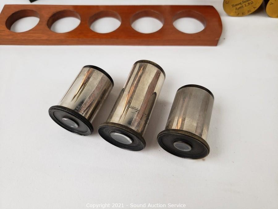 Lot Details: No. 18427. Comes with locking wood case with skeleton key. In good working condition. Brass lens cases & 2, 4 & 8x lenses. 14" x 7" x 8" case.