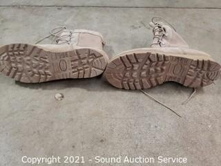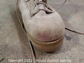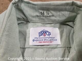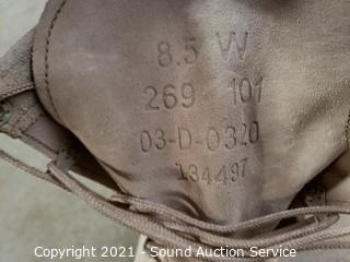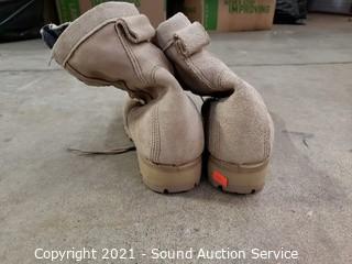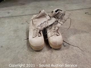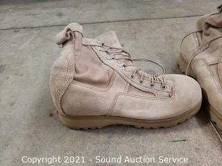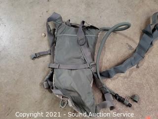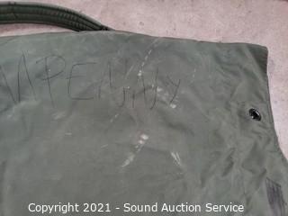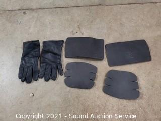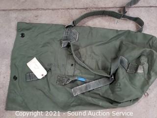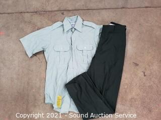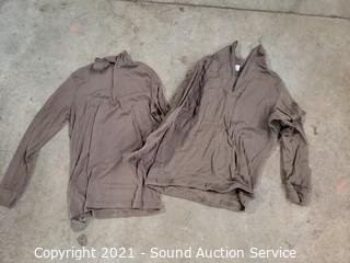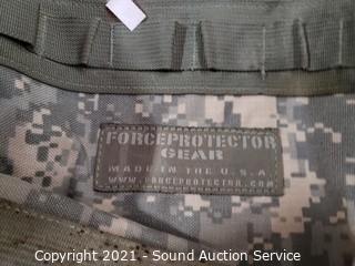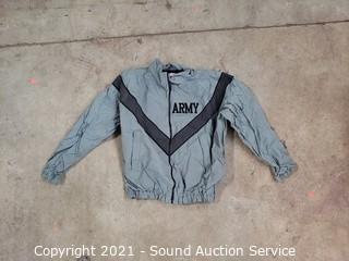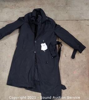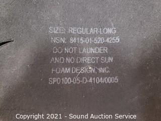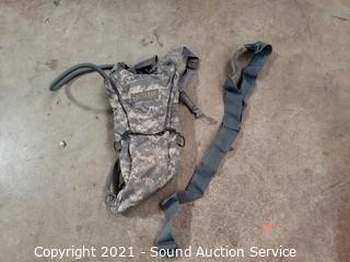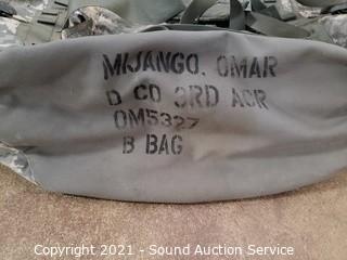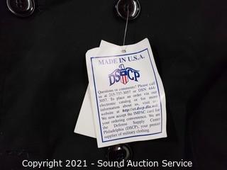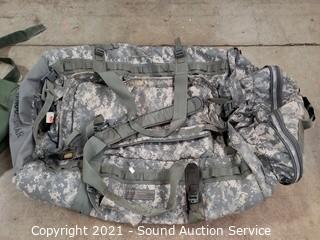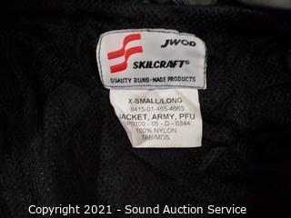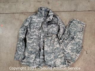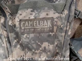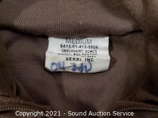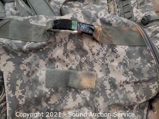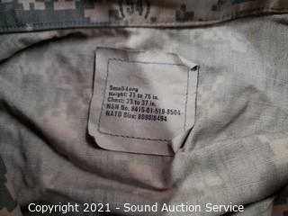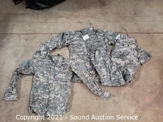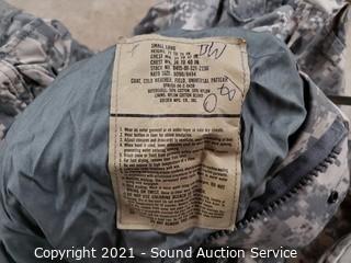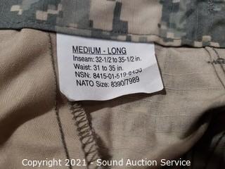 Lot Details: Includes thin layer thermal size medium, heavy layer thermal size medium, camo top size small/long, camo pants size medium/long, army jacket size XS/long, green dress pants size 30L, green button down short sleeve shirt size small, cold weather camo top size small/long, leather gloves size 8, boots size 8.5 wide, camelback backpack, black trench coat size 32-38 L (with original tags), camo top size small/long (new with tags), camo pants size medium/long (new with tags). Bags are approx. 30" x 22", 38" x 20" and 37" x 25".