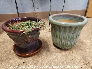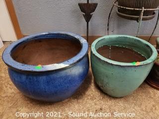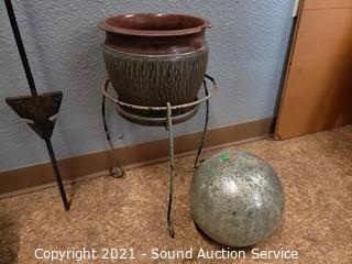 Lot #0425: 5 Planters, Shepard Hook, Gazing Ball& Plant Stand