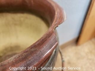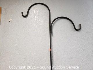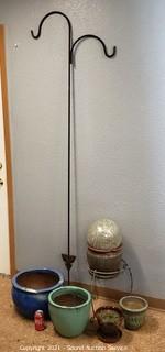 Lot Details: 7ft wrought iron Shepard hook, 15" H x 12" wrought iron plant stand, 9" gazing ball, 6.5" H x 7" to 10" H x 15" pottery planters. One is chipped refer to photos.