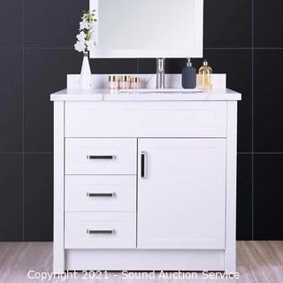 Lot Details: 1 cabinet, with natural marble top & backsplash, ceramic sink, & stainless faucet. Model AFBV361W. 34-5/8" H x 36" W x 22" D. Factory sealed. $999 retail value. Stock images, when included, are representations of the items and are not guaranteed to be exactly what is in the lot.