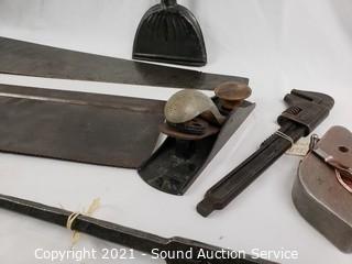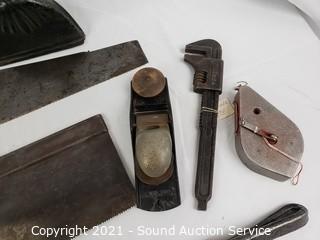 Lot Details: Crosscut saw, miter saw, steel plane, adjustable wrench, chalk line & more.