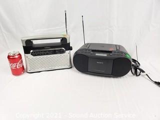 Lot Details: Sony has a CD/Cassette both are AM/FM. Both work. Radio Shack has a bent antenna. 8" x 10" x 2.5" & 5.5" x 12" x 7".