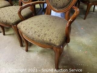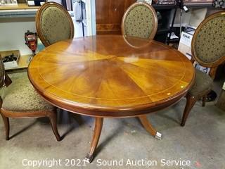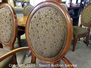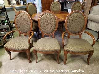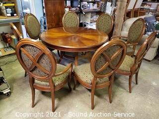 Lot Details: Comes with 8 cameo back chairs, 2 are captains. Some wear to the finish, refer to photos. Made in Columbia. 30" x 52" diameter table with 24" leaf.