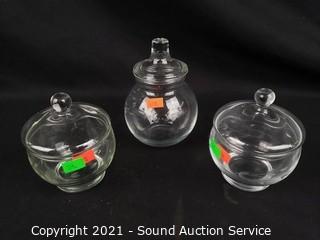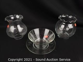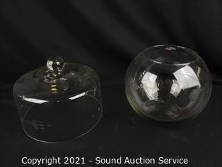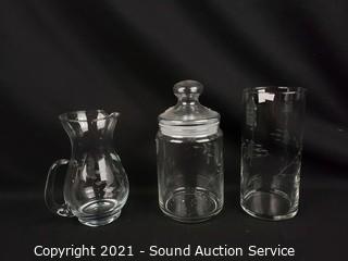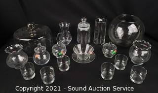 Lot Details: Cake plate cover, pitcher and cups, covered dishes, vases and fish bowl.