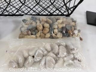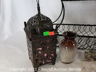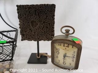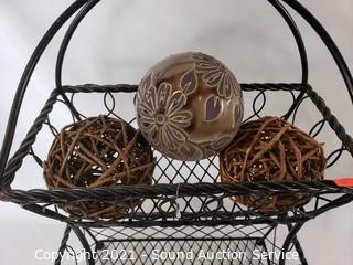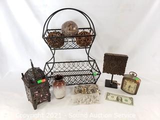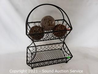 Lot Details: 2-tier wire basket 18" H x 14" x 7", clock, spheres, potpourri tin, vase.