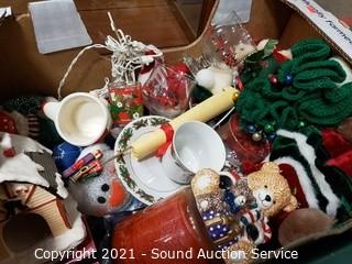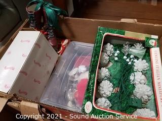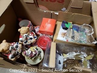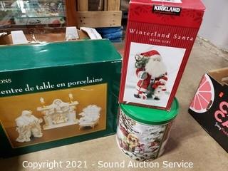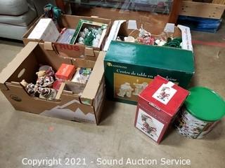 Lot Details: Porcelain centerpiece set, ornaments, string lights, stuffed animals, figures, mugs & more.