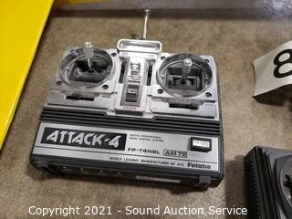 Lot Details: Some of the plastic covering has some damage, tail fin is loose, has a OSE-3030 engine, Futaba Attack Sport FP-T2NCS and Futaba Attack 4 FP-T4NBL controllers, basal wood wraps, fuel tank, battery and other parts. Looks to be complete, wouldn't take much to get it going. 48" long with 60" wingspan.