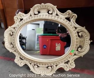Lot Details: 19" x 16" mirror, ceramic frame by New Art studio, 35" x 19" wall clock quartz movement, unknown condition.
