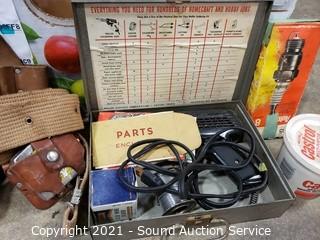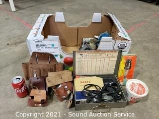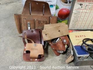 Lot Details: Leather tool bags, chisels, square, hose nozzles, spark plugs, grease & more.