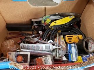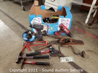 Lot Details: Caulk gun, plane, drum auger, laser line, stud finder, Bosch 18v cordless drill no charger, Milwaukee 1/2" 18v Hammer drill no battery or charger, hammers, files & more.