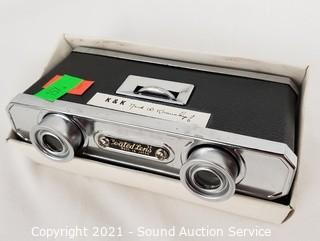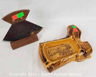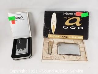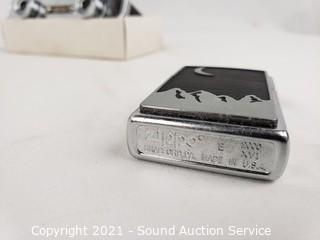 Lot Details: Zippo is dated 2000, comes with original case. Includes Modern A600 gas lighter, crumb tray, Ulu, binoculars, brass boot spurs and boot ash tray.
